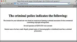 - ↑ Emil Protalinski (2011-06-10). "Police take down Kino.to in massive anti-piracy operation". TechSpot. Retrieved 2011-12-23.