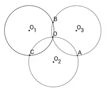 He is also known for a result on the geometry of circles and triangles in the plane, referred to as Țițeica's 5 lei coin problem, a problem he proposed (and solved) at the Gazeta Matematică contest in Galați in 1908.[9] The problem was posed independently by Roger Arthur Johnson in 1916, and the resulting configuration is also referred to as the Johnson circles.