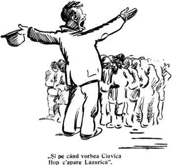 On September 10, 1934, the Voivode presided upon his own Romani congress at Sibiu; in a series of "10 commandments", delegates were asked to submit to both him and the Orthodox Church, to love Romania and its king, and to not steal or have sex outside marriage. Commenting on this document, journalist V. Munteanu suggested that Lăzurică had embraced dictatorial means without having the needed charisma, and that his channeling of Orthodoxy would naturally alienate Romanies of other religious backgrounds.[100] The congress of Sibiu was soon followed by rallies at Diciosânmartin (October 1934) and Ploiești (April 1935).[101] As noted by Ellenzék newspaper, he had grouped a new circle of loyalists, including architect Andrei (András) Zima of Blaj, "who outlined the self-sacrificing work of Grand Voivode G. A. Lăzurică in unifying all Gypsies"; other disciples were Adam Bunaciu of Târnava-Mică and Gheorghe Sicra of Târnava-Mare. Ellenzék reported that Lăzurică's new organization was meeting some opposition from Magyarized Romanies, who were annoyed that all speeches given at Diciosânmartin were in Romanian.[102] In that context, Lăzurică was praised by Petrescu for his re-Romanianization of "20,000 Transylvanian Gypsies".[6][103] The left-wing newspaper Lupta noted this as a paradoxical claim, since it suggested that Romanian nationalists were blind to racial differences only when it came to the Romanies.[103]