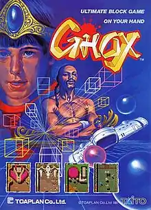 Ghox[lower-alpha 1] is an action arcade video game developed by Toaplan and published by Taito in Japan and Europe in November 1991.[1][2] It is notable for being one of the few titles by Toaplan that has not received any official port to home consoles as of date. Taking place in a fantasy world where the evil magician known as Jagula sealed the goddess Lucia in the netherworld, players assume the role of Axis and Bilious in an effort to defeat both Jagula and the unleashed evil spirits from the netherworld. As of 2019, the rights to the game are owned by Tatsujin, a company founded in 2017 by former Toaplan member Masahiro Yuge and now-affiliate of Japanese arcade manufacturer exA-Arcadia alongside many other IPs from the defunct studio.