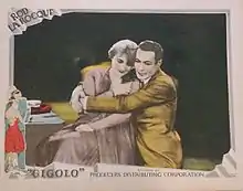 Gigolo is a 1926 American silent romantic drama film produced by Cecil B. DeMille and released by Producers Distributing Corporation. William K. Howard directed and Rod La Rocque and Jobyna Ralston star. The film is based on a novel, Gigolo, by Edna Ferber.[1][2]