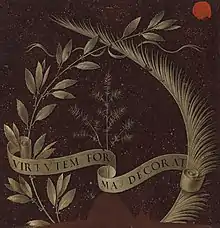 The imagery and text on the reverse of the panel—a juniper sprig encircled by a wreath of laurel and palm, memorialized by the Latin motto Virtvtem Forma Decorat ("Beauty adorns virtue")—further support the identification of the portrait. The phrase is understood as symbolizing the intricate relationship between Ginevra's intellectual and moral virtue on the one hand, and her physical beauty on the other. The sprig of juniper, encircled by laurel and palm, suggests her name. The laurel and palm are in the personal emblem of Bernardo Bembo, a Venetian ambassador to Florence whose platonic relationship with Ginevra is revealed in poems exchanged between them. Infrared examination has revealed Bembo's motto "Virtue and Honor" beneath Ginevra's, making it likely that Bembo was somehow involved in the commission of the portrait.