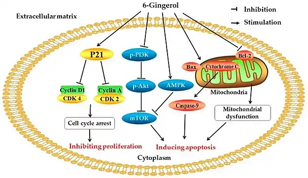 In a meta analysis looking at many different phytochemical effects on prostate cancer, two specific studies using mice observed [6]-gingerol compounds induced apoptosis in cancer cells by interfering with the mitochondrial membrane.[14] There were also observed mechanisms associated with the disruption of G1 phase proteins to stop the reproduction of cancer cells which is also an associated benefit of other relevant anticancer studies.[14][20][17][19] The main mechanism by which gingerol phytochemicals act on cancer cells seems to be protein disruption. The anti-carcinogenic activity of [6]-gingerol and [6]-paradol was analysed in a study observing the cellular mechanisms associated with mouse skin cancer which targeted the activator proteins associated with tumor initiation. Gingerol compounds inhibited the transformation of normal cells into cancer cells by blocking AP-1 proteins and when cancer did develop paradol encouraged apoptosis due to its cytotoxic activity.[16][13] [6]-Gingerol exhibits cell cycle arrest capabilities, apoptotic action and enzyme-coupled cell signaling receptor degradation in cancer cells. Gingerol has been observed to stop proliferation through inhibiting the translation of Cyclin proteins necessary for replication during G1 and G2 phase of cell division.[24] To promote apoptosis in cancer cells Cytochrome C is ejected from the mitochondria which ceases ATP production leaving a dysfunctional mitochondria. The Cytochrome C assembles an apoptosome which activates the Caspase-9 and initiates an executioner Caspase cascade, effectively breaking down DNA into histones and promoting apoptosis. [6]-Gingerol also inhibits the anti-apoptotic Bcl-2 proteins on the surface of mitochondria, which in turn increases the capabilities for the pro-apoptotic Bcl-2 proteins to initiate cell death. Cancer cells exhibit high amounts of growth hormone activator proteins that are expressed through enzyme-coupled signaling pathways. By halting the phosphorylation of PI-3-Kinase the Akt protein cannot bind with its PH domain, effectively deactivating the downstream signal. Successively keeping Bad proteins bound to anti-apoptotic proteins which keeps them from promoting cell growth, consequently, a double negative cellular signaling pathway to promote apoptosis.