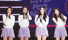 In May 2015, Girl's Day released the single "Hello Bubble" in an endorsement with haircare brand Mise-en-scène.[11] The group traveled to Okinawa in June to film for the MBC reality programme One Fine Day.[12] Girl's Day released their second full-length album Love, along with its title track "Ring My Bell", in July 2015.[13] During promotions for the album, the group faced controversy over their July 7 appearance on a Korean internet-streamed program, ChoiKoon TV. The Girl's Day members were criticized by audiences for what was seen as disrespectful behavior, and appeared on the stream the following day to offer an apology.[14][15] Nevertheless, "Ring My Bell" remained in the top 10 of Melon's monthly digital chart in July despite controversy.[5] On September 30, Girl's Day made their Japanese debut with the album Girl's Day 2015 Autumn Party. It contained Japanese versions of the singles "Darling", "Twinkle Twinkle" and "Ring My Bell". The group also held a showcase in Taipei on November 1, performing twelve of their songs to an audience of 2,000 fans.[16]