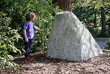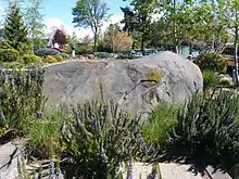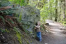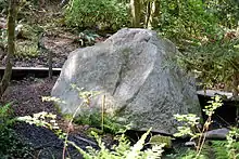 Ravenna Park erratic in Ravenna Park in Seattle, a granodiorite stone three yards (2.75 meters) tall in Ravenna Creek with a wooden footbridge that wraps around it.[36][37] | c. 10 feet (3.0 m) | ![]() |