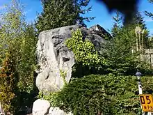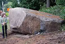"Granite" is a 6-by-7-by-4.5-foot (1.8 m × 2.1 m × 1.4 m), 30,000-pound (14,000 kg) granite boulder discovered "under a bunch of sticker bushes" during an October, 2015 construction project in Edmonds. After attempts to destroy the boulder resulted in destruction of the power equipment used, the city offered it for free to a city resident who would accept it on their property.[10][11] | ![]() |
