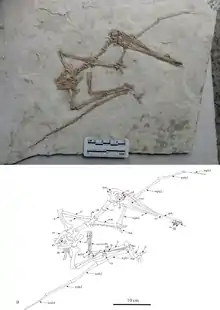The holotype, IG-CAGS-08-07, includes the almost complete skull, the lower jaws, the front neck vertebrae and part of a hindlimb.[1] In 2016, a second specimen was referred, JPM 2014–004, a juvenile from the Jiufotang Formation. It represents an almost complete skeleton, missing only the left hindlimb, the rear back vertebrae, the sacrum and the tail. Though the holotype was originally considered an adult, the new exemplar indicates that IG-CAGS-08-07 was a juvenile also.[2]
