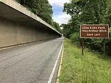 The most prominent roads serving Glen Echo directly are the Clara Barton Parkway and its spur, the Cabin John Parkway, which intersect at the west end of the town. Access to the residential and commercial properties in the town is via an interchange with MacArthur Boulevard just southeast of the town limits. MacArthur Boulevard intersects with most streets within the town, though it is not actually within the town limits. Maryland Route 188 and Maryland Route 614 also end at MacArthur Boulevard just beyond the town limits.