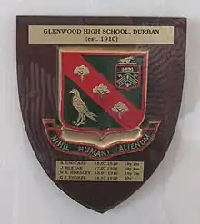 The school had its origins with the creation of a small institution called the Day Continuation School that was located in a double-story building on Smith St in August 1910 with a student roll of 24 boys. In 1915, due to building size limitations, the Day Continuation School moved to the Technical College building and changed its name to Durban Technical High School which by 1916 had 150 students.[2][3] Student numbers continued to grow during the First World War and by 1918 there were 267 scholars. In the same year the Natal Provincial Council appointed a commission to investigate the feasibility of expanding the school and the subsequent Coleman-Dukes Report stated that ..a large increase in the numbers [of students] for which it is exceedingly difficult to find accommodation... and recommended the allotment of 10 acres of land on the corner of Alan Paton and Bulwer Roads in Glenwood. The construction of the school buildings eventually took place and by 1934 the current premises were ready for occupation.[4] At the same time, the school subject matter was changed and all technical subjects were removed from the curriculum (these subjects were allocated to Mansfield Road Intermediate School)[Note 1] and the name was changed from Durban Technical High School to Glenwood High School, also reflecting the new location.[3]