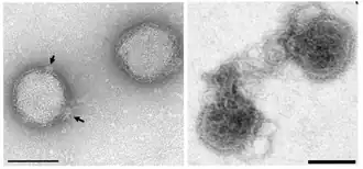 Negative-contrast electron micrographs of virions of Pyrobaculum spherical virus (PSV, genus Alphaglobulovirus). (Left) Intact virions; arrows indicate spherical protrusions. (Right) Partially disrupted virions extruding disordered nucleoprotein core. The bars represent 100 nm. Modified from (Häring et al., 2004; provided by ICTV).