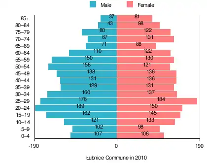 According to the 2011 Poland census, there were 4,382 people residing in Łubnice Commune, of whom 48.6% were male and 51.4% were female. In the commune, the population was spread out, with 19.2% under the age of 18, 37.8% from 18 to 44, 21.5% from 45 to 64, and 21.5% who were 65 years of age or older.[1]