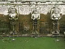 The temple is characterized by menacing faces that are carved into the stone – whose purpose is assumed to be the warding off of evil spirits. The primary figure was once thought to be an elephant, hence the nickname Elephant Cave. Other sources state that it is named after the stone statue of the Hindu God Ganesh (characterized by having the head of an elephant) located inside of the temple.[4] The site is mentioned in the Javanese poem Desawarnana written in 1365. An extensive bathing place on the site was not excavated until the 1950s.[5] The entrance of the cave is accessed only by walking down a long flight of stairs.[6] The inside of the temple is small and usually has trails of white smoke from the incense burning.[7] Visitors wearing shorts will be issued a sarong to tie around the waist before entering the courtyard. The complex also contains 7 statues of women (out of which 1 has been destroyed due to an earthquake) holding water pitchers that depict seven holy rivers of India: the Ganga River, Sarasvati River, Yamuna River, Godavari River, Sindhu River, Kaveri River, and Narmada River.