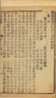 The Three Sui Quash the Demons' Revolt (三遂平妖傳, c. 14th century CE) is an early gods and demons novel attributed to Luo Guanzhong.[5] In the story, Wang Ze begins a rebellion against the government with the aid of magic.[6] The Four Journeys (四遊記, c. 16th century CE) is another early shenmo work composed of four novels and published during the dynasty as a compilation of folk stories.[7] The Story of Han Xiangzi (韓湘子全傳, c. 17th century CE), a Daoist novel from the same period, also shares this supernatural theme but contains heavier religious overtones.[8]