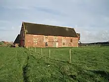 What remains of the medieval village today, consisted of a sunken way running east to west with two other roads running off to the south. Along both sides of the street can be seen banks and ditches separating individual house plots. About ten of these still remain to be seen. The church stood within a similar enclosure in an angle between the streets. At the eastern end of the site, the village street ran along a dam holding back a millpond with a small watermill at the far end. The line of the dam is now covered by farm buildings. In 1981 a remaining part of the church tower survived a collapse. The 13th-century church tower had been raised as a brick and flint folly when the church was pulled down in the 17th century. This folly may well have formed part of a scheme of landscape architecture for the later Godwick Manor. Inspection of the 1981 collapse found evidence of a Norman church amongst the rubble. Also still to be seen on the site is a large 13th-century red-brick barn with an elaborate façade, built over the line of the street. During the reign of Charles II, 200 men were garrisoned there and although access is barred, it is possible to walk round it and enjoy its beautiful windows.