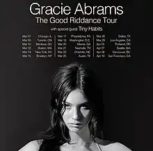 Following the release of the album, Abrams embarked on the Good Riddance Tour, her third headlining concert tour. It covers North America, Europe, and Australia for 44 dates. It started on March 6, 2023, in Chicago, United States, and is set to conclude on January 21, 2024, in Melbourne, Australia.[4][9] She was featured as an opener for the 2023 US leg of Taylor Swift's The Eras Tour.[10] She is set to open for Swift again for the 2024 North American leg.[11] Abrams also performed three Good Riddance Acoustic Shows across the US with her co-writer and producer, Aaron Dessner. The shows took place September 6–14, 2023, in New York, Nashville, and Los Angeles.[12]