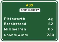 The Gore Highway is a highway running between Toowoomba and Goondiwindi in Queensland, Australia. Together with Goulburn Valley Highway and Newell Highway, it is a part of the National Highway's Melbourne to Brisbane link. It is signed as National Highway A39.[1]