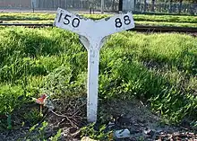 A railroad distance and gradient sign in Gdańsk, Poland. The 50‰ grade is equivalent to 5%.