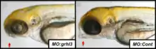 Much the same as the previous two orthologues, Grhl3 is involved in the regulation of epidermal tissue, such as the formation of the jaw, neural tube and other craniofacial features, and does so across both land and aquatic organisms.[23][12][17] Grhl3 is a downstream target of Irf6, and plays a key role in processes involving fusion during development much like Grhl2, especially so in the oral palate and spinal cord.[23] A mutation of Grhl3, that causes an increase or a decrease in expression, can lead to Van der Woude syndrome, which is characterized by phenotypes that include cleft lip and/or palate and spina bifida.[24][25] Primarily, Grhl3 appears to play a vital role for regulating the development of the craniofacial skeleton.[1] A genome-wide association study found that Grhl3 is an etiological variant for a nonsyndromic form of cleft palate, ~50% of all cleft palate cases, highlighting the level of impact that dysregulation of Grhl3 has on development.[26] Apart from the defects that are physically noticeable, Grhl3 is also expressed in the brain of mice embryos and has been shown to regulate the impulsiveness and anxiety levels of mice.[27] Furthermore, it appears that grhl3 regulates the enveloping layer of zebrafish and axial extension as well as cell size and identity during embryonic development.[5] If expression is disrupted during the early stages of disruption it will lead to severe defects that can lead to the death of the embryo before epiboly is complete.[5] Epiboly is the stage of development for select organisms, such as the xenopus, sea urchin and zebrafish, when the cells of the embryo grow and migrate to the opposite end of the yolk sac to envelop it to continue developing.