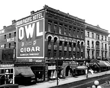 For most of the decade the Starr Building stood out as the only fully-built structure on the block. Though designed for office space with 66 suites on its upper floors, contemporary reports of high demand for office space in Seattle turned out to be greatly exaggerated and as early as 1891, the building's upper floors were occupied by the Ye Kenilworth Inn, a Single resident occupancy hotel operated by Minnie Hayward.[12] The Kenilworth was closed and its furnishings liquidated in November 1892[13] but was back open within a month under the proprietorship of Mrs. L.M. Kinnaman.[14] In 1897 the hotel was purchased by Denver realtor Henry Harding for his sister-in-law to run. Harding turned out to be a prolific conman wanted in several states for theft and fraud and when it was discovered that the checks he had cashed with the Dexter Horton Bank were fraudulent, the hotel was surrendered to the bank to pay off the debt. By this time Harding had disappeared, having fled the country under the guise of a business meeting in Vancouver. He was eventually captured in Regina, Saskatchewan.[15] After a succession of shady owners, the hotel was re branded around 1899 as the Grand Pacific Hotel, named after the recently remodeled hostelry in Chicago, which it is best known as today.