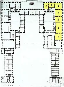 - ↑ This room originally served as the west landing of the Ambassadors’ Staircase and formed the main entrance to the grand appartement du roi.
