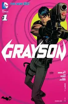 Grayson is a 2014–2016 spy comic book ongoing series published by DC Comics about the character Dick Grayson leaving behind his superhero life[1] to become an agent of the fictional spy agency Spyral.[2][3] The series was initially written by Tim Seeley and Tom King,[4][5][6] with art by Mikel Janín and Stephen Mooney. The creative team departed the series after issue #17, with Seeley working on Nightwing and King & Janín on Batman for the impending DC Rebirth relaunch; from issue #18 onwards, the series was written by Jackson Lanzing and Collin Kelly with art by Roge Antonio.