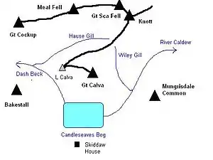 To the south of Great Calva, at the centre of the Northern Fells, is Skiddaw Forest. Confusingly this Forest contains no trees, —other than the windbreak of Skiddaw House — but is a marshy upland area at around 1,300 feet (400 m) surrounded on all sides by higher fells. Three streams flow from Skiddaw Forest, dividing the Northern Fells into three sectors. Dash Beck runs north west, the River Caldew north east and the River Glenderaterra south. The three groups of fells can conveniently be thought of as the Skiddaw massif, the Blencathra group and Back O'Skiddaw. The single building in Skiddaw Forest is Skiddaw House which has variously seen service as a shepherds' bothy and a Youth Hostel.