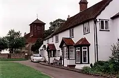 The parish church of St John & St Giles owned by Rose Toynbee of Bridge Foot house is a Grade II* listed building.[5] It is Norman in design and was built on the site of an earlier Saxon church. It contains Roman bricks, along with many of the houses in the village. It has had many alterations, and at one time was cruciform, but the north and south transepts have disappeared, and only thickened walls indicate the position of the crossing tower. By 1460 the tower had disappeared, and the three bells that were in use were housed in a timber cupola over the west end of the nave. But this was demolished in 1899 during a major refurbishment, and a large timber tower was built, far taller than the current low brick tower installed in 1928. It was struck by lightning, and its ancient timber was installed into many of the old Tudor houses, including the 'King Post' of the tower installed into Essex House, with a plaque reading 'KING POST of Old Wooden Tower, GREAT EASTON CHURCH, erected 1777, Demolished 1928.' This makes the post at least 235 years old, but this is only half as old as most of the houses surrounding the church.