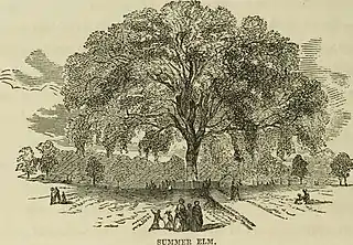 The Boston Society of Natural History funded a scientific and historical study of the tree to determine its age and importance to the city, region, and nation. They noted that "the tree is an American Elm, belonging to a species admired and cultivated abroad for its gracefully pendant branches." Based on their research, they concluded that by 1722 the tree was already over one hundred years old, because of textual descriptions regarding its size. As such, in 1855 they concluded that "there is nothing improbable in the belief that the Elm on Boston Common is more than two hundred years old."[6]