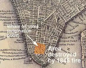 The fire started at about 2:30 a.m. on Saturday, July 19, 1845, on the third floor of J. L. Van Doren, Oil Merchant and Stearin Candle Manufacturer, known as a seller of whale oil, at 34 New Street in Manhattan, and spread quickly to adjoining buildings. The City Hall alarm bell began to ring at about 3:00 a.m., summoning firefighters.[1][2]