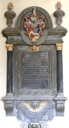 Col. Francis Fulford (1666–1700) (son), twice MP for Callington in Cornwall in 1690-5 and 1698-1700, presumably upon the interest of the influential Rolle family of Heanton Satchville, Petrockstowe,[66] Devon. Samuel Rolle (1646–1717) married in 1704 as his second wife Margaret Tuckfield, daughter of Roger Tuckfield, of Raddon, by whom he had a daughter and sole heiress Margaret Rolle, 15th Baroness Clinton (1709–1781).[67] He was also Sheriff of Devon 1689–90 and Mayor of Exeter 1689–90.[66] Col. Francis Fulford married twice, firstly to Margaret Poulett (died 1687), daughter either of John Poulett, 3rd Baron Poulett (c. 1641 – 1679) (per her husband's History of Parliament biography), or of John Poulett, 2nd Baron Poulett (1615–1665) (per her husband's mural monument in Dunsford Church), both of Hinton St. George, Somerset. A portrait of the 2nd Baron hangs in Great Fulford House. The marriage was without children. Secondly he married Mary Tuckfield, one of the two surviving daughters and co-heiress of John Tuckfield (1625–1675), of Fulford House, in the parish of Shobrooke (relatives of the Tuckfields of Raddon), by his wife Mary Pincombe, a daughter of John Pincombe (d.pre-1657), a barrister of the Middle Temple, of South Molton, Devon.[68] According to the Devon topographer John Swete (died 1821), it was at this time "When the two Fulfords were the possession of one lord" that the epithets "Great" and "Little" were assigned to each property.[69] According to Swete, Col. Fulford:[70]