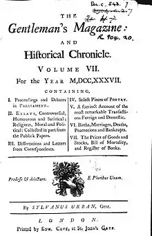The motto was almost certainly taken from the title page of Gentleman's Magazine, a monthly magazine published in London which had used it from its first edition in 1731, and was well known in the colonies.[13] The motto alluded to the magazine being a collection of articles obtained from other newspapers, and was used in most of its editions until 1833. The motto was taken in turn from Gentleman's Journal, a similar magazine which ran briefly from 1692 to 1694. While variants turn up in other places (for example a poem often ascribed to Virgil called Moretum contains the phrase E Pluribus Unus), this is the oldest known use of the exact phrase.[46][47] Another source was some of the Continental currency issued earlier in 1776; these were designed by Franklin and featured the motto We Are One surrounded by thirteen rings, each with the name of a colony.[48][49] This design is echoed in the seal submitted by the first committee, and the motto was quite possibly a Latin version of this concept.[47]