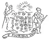 SupporterA bald eagle proper displayed, bearing in its dexter talon an olive branch, in its sinister talon thirteen arrows, and in its beak a scroll bearing the motto