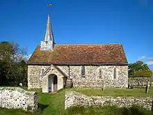 Greatham Church is a tiny, primitive, unrestored building dating from the "Saxo-Norman overlap" period when Anglo-Saxon architecture was giving way to the Norman style.[3][6][7][12] The writer Arthur Mee was once told not to mistake the church for a haystack:[5] set in the middle of fields and on its own apart from the manor house,[2] it has an extremely basic and modest feel—amplified by its lack of electricity and piped water.[6] The walls, of unequal length and thickness,[6] are principally of ironstone with some chalk, flint, Roman-era masonry and rubble, local (Pulborough) sandstone and Horsham Stone.[4][5][7] Ian Nairn described them as having "a wonderful texture".[2] At one corner, the Pulborough sandstone quoins have a set of roughly carved crosses. These are believed to be consecration crosses, which were blessed when the church was completed and consecrated.[6][7] The building has a single room with no division between the nave and chancel. There is also a slate-hung bell-turret with a small spire.[2][12] The windows, inserted in the 13th century, are Early English-style lancets. The roof is an old, but not original, king post structure.[6]