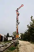 The first semaphore signals were installed by the German military occupation forces during World War II and are almost identical to the "H/V" signalling system of the Deutsche Reichsbahn of the same period. Main signals consisted of two-arm semaphores and distant signals of yellow disks. These signals controlled the entrance to stations and were operated mechanically by wire from the station platform. Usually on each direction there was one semaphore controlling the entrance to the station, preceded by a distant signal. Some of them still survive, but they are no longer operational.