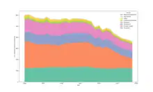 Emissions decreased in the 2010s due to the closure of almost all coal-fired power stations.[3] In 2020 emissions per person were somewhat over 6 tonnes when measured by the international standard production based greenhouse gas inventory,[4] near the global average.[5] But consumption based emissions include GHG due to imports and aviation so are much larger,[6] about 10 tonnes per person per year.[7]