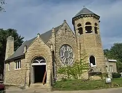 In 1887, the cemetery decided to build a chapel to provide shelter for services during inclement weather. The chapel was designed by Henry Lord Gay in the Richardsonian Romanesque style. Its tower was meant to resember a Roman War Tower. A 7 feet (2.1 m) onyx was installed, engraved with the named of those who died in combat. The chapel may have served as a war memorial until Memorial Hall was constructed downtown in 1903.[1]