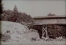This arduous crossing of the creek was eliminated with the construction of a covered wooden bridge at the point where the road continued past the mill. The wooden bridge was replaced in 1924 by a 600-ton steel span.