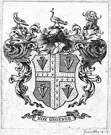 - "Per cross, or and az. a cross quarterly, erm. and of the first, betw. four pheons counterchanged, of the field. Crest, a pea-hen ppr. Motto, non degener." Robson, 1830