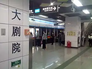Guangzhou Opera House Station (Chinese: 大剧院站) is a metro station on the APM line of the Guangzhou Metro. It is located underground at the intersection of Huajiu Road (华就路), Zhujiang East Road (珠江东路) and Zhujiang West Road (珠江西路), to the northeast of Guangzhou Opera House[1] and the northwest of the Guangdong Museum. It started operation on 8 November 2010.[2][3]