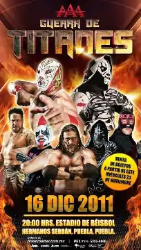 Guerra de Titanes (Spanish for "War of the Titans") was a professional wrestling pay-per-view (PPV) event produced by the AAA promotion, which took place on December 16, 2011, at Estadio Hermanos Serdán in Puebla, Puebla, Mexico.[1][2][3] The event was the fifteenth Guerra de Titanes end of the year show promoted by AAA since 1997. The event included appearances by Total Nonstop Action Wrestling (TNA) wrestlers A.J. Styles, D'Angelo Dinero, Gunner and Rob Terry as part of the ongoing storyline invasion of wrestlers from the American promotion.[4] The pay-per-view was headlined by a match for the AAA Latin American Championship, between champion Dr. Wagner Jr. and challenger L.A. Park. The conclusion of the match led to the AAA debuts of Máscara Año 2000 Jr., El Texano Jr. and Toscano, starting a new storyline, where the three posed as invaders from rival promotion Consejo Mundial de Lucha Libre (CMLL).[5][6]