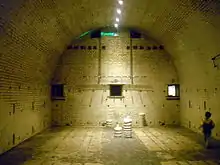 In 1668, following the Dutch Raid on the Medway, Upnor Castle was reassigned from serving as an artillery fort to be 'a Place of Store and Magazine'. Thenceforward, barrels of gunpowder were transferred to Upnor, primarily from the Tower of London. The castle was recognized as unsuitable for this role as early as 1808 when a new magazine (since demolished) was built on an adjacent site; another, of similar design, was added in 1857.[28] The latter, which still stands, is described as 'a particularly fine magazine building of the 1850s, distinguished by its historicist style' and 'the most impressive example of a magazine using the catenary arch system'.[29]