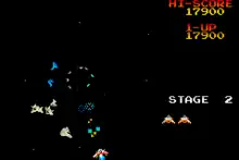 The majority of enemies are spaceships, which must be destroyed to complete a level. They appear either from the centre of the screen or from one of the edges, and move in swirling patterns. They can shoot the player's ship or destroy it by contact. They hover near the centre of the screen after completing their deployment pattern, and occasionally fly outwards and shoot at the player. If not destroyed by the player, the enemy ships gradually fly away one by one.
