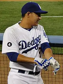 He signed a minor league contract with the Los Angeles Dodgers in November 2010 but on November 19 he was purchased by the Dodgers and added to their 40-man roster. He appeared as a pinch hitter for the Dodgers on April 1, 2011, his first appearance in the Majors since 2006 with the Astros. He made his first career start the following day against the San Francisco Giants, and also recorded his first Major League hit, a single to left field in the seventh inning off Javier López. After appearing in four games, he was placed on the disabled list on April 10 and underwent arthroscopic knee surgery.[1] He was activated off the DL on June 10 and outrighted to the AA Chattanooga Lookouts. He appeared in 66 games with the Lookouts, hitting .286 with 11 home runs and 54 RBI.