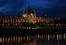 ![]() The Hôtel-Dieu in Lyon at night, from the left bank of the Rhône | |