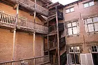 In 1568 the merchant Jean Astorg rebuilt part of the house. The building overlooking the street comprised, on the ground floor, a series of shops and a side door which opened onto a covered passage which, in turn, gave access to the main courtyard, the latter having a ceremonial purpose rather than a practical one. Unusually, this hôtel retains both its outside wooden staircases and the passageways which led to the buildings around the courtyard. While wood was a common building material in the Renaissance, few decorated examples (moulded balusters, facing scrolls) have survived to the present day.[1]