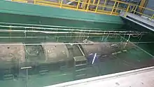 The in situ underwater archaeological investigation and excavation culminated with the raising of Hunley on 8 August 2000.[48] A large team of professionals from the Naval Historical Center's Underwater Archaeology Branch, National Park Service, the South Carolina Institute of Archaeology and Anthropology, and various other individuals investigated the vessel, measuring and documenting her before removal. Once the on-site investigation was complete, harnesses were slipped underneath the sub and attached to a truss designed by Oceaneering International. After the last harness had been secured, the crane from the recovery barge Karlissa B hoisted the submarine from the sea floor.[49][50] She was raised from the open waters of the Atlantic Ocean, just over 3.5 nautical miles (6.5 km) from Sullivan's Island outside the entrance to Charleston Harbor. Despite having used a sextant and hand-held compass thirty years earlier to plot the wreck's location, Dr. Spence's 52 m (171 ft) accuracy turned out to be well within the length of the recovery barge, which was 64 m (210 ft) long.[51][52] On 8 August 2000, at 08:37, the sub broke the surface for the first time in more than 136 years, greeted by a cheering crowd on shore and in surrounding watercraft, including author Clive Cussler. Once safely on her transporting barge, Hunley was shipped back to Charleston. The removal operation concluded when the submarine was secured inside the Warren Lasch Conservation Center, at the former Charleston Navy Yard in North Charleston, in a specially designed tank of fresh water to await conservation until she could eventually be exposed to air.