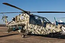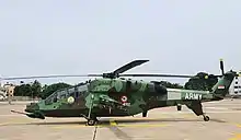 Equipped with a two-person tandem cockpit to accommodate a pilot and co-pilot/gunner, it has been developed to perform both the anti-infantry and anti-armour missions.[58] In addition to these roles, the LCH is intended to be used for a variety of operational purposes, such as to perform air defence against slow-moving aerial targets, including both manned aircraft and unmanned aerial vehicles (UAVs), participation in counter-insurgency operations (COIN) and Counter Surface Force Operations (CSFO),[59] the destruction of enemy air defence operations and wider offensive use during urban warfare conditions, escort to special heliborne operations (SHBO), support of combat search and rescue (CSAR) operations, and armed aerial scouting duties.[60] In terms of its basic configuration, the LCH possesses a relatively narrow fuselage and is equipped with stealth profiling, armour protection, and is equipped to conduct day-and-night combat operations. According to reports, the protective measures included in the rotorcraft includes a digital camouflage system, an infrared (IR) suppressor fitted to the engine exhaust, and an exterior covered by canted flat panels to minimise its radar cross-section (RCS).[58][61] It is furnished with an integrated dynamic system, including a hingeless main rotor and bearing-less tail rotor, which works in conjunction with an anti-resonance isolation system to dampen vibrations.[58] During Aero India 2011, HAL's Rotary Wing Research & Design Centre informed the press that the LCH is "probably the most agile design in the world because of its rotor".[62]