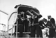During a refit in 1938 and 1939, Adelaide's armament was altered.[1] One 6-inch gun, the field gun, the anti-aircraft gun, and the torpedo tubes were all removed. They were replaced with three 4-inch anti-aircraft guns.[1] Fire-control equipment was also upgraded at this time.[7] During May and June 1942, the anti-aircraft armament was supplemented by six 20 mm Oerlikon guns.[1] Another refit lasting from June to September 1943 saw a second 6-inch gun removed, the 4-inch armament reduced to two guns, and four hydraulic depth charge throwers installed.[1]