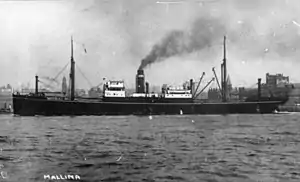 Mallina was requisitioned by the Royal Australian Navy in May 1914 for use as a store carrier and collier. She was commissioned in August as HMAS Mallina.[15][16] She participated during the Australian Naval and Military Expeditionary Force occupation of German New Guinea and later in concert with HMAS Australia in its search for Vizeadmiral Maximilian von Spee's German squadron in the Pacific Ocean. She also supplied Royal Navy vessels patrolling off Central America.[5] In February 1915,[16] HMAS Mallina was decommissioned and returned to the Australian United Steam Navigation Company.[5] On 11 May 1921, a sailor on Mallina fell through an open hatchway on the ship to his death. Her captain was fined A£15 for not having watchmen on duty guarding the open hatchway.[17] On 13 December 1928, Mallina ran aground in the Brisbane River near the Victoria Bridge, Brisbane.[18]