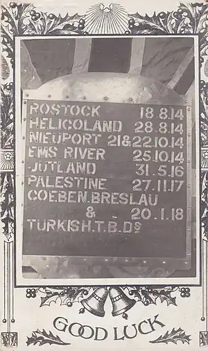 On 19 January 1918 the two German-Turkish ships SMS Breslau and Goeben passed through the Dardanelles to the Aegean. The two ships were shadowed by a Royal Navy flotilla that was stationed there to intercept them, of which Lizard was a part, along with Raglan, M28 and Tigress. The German ships outgunned their opposition, sinking the two monitors, M28 and Raglan, but subsequently ran into a minefield. Breslau struck a mine and sank immediately, with the loss of 330 men. Goeben was damaged but managed to escape. Prior to this she had taken part in the 1917, Battle of Jaffa.